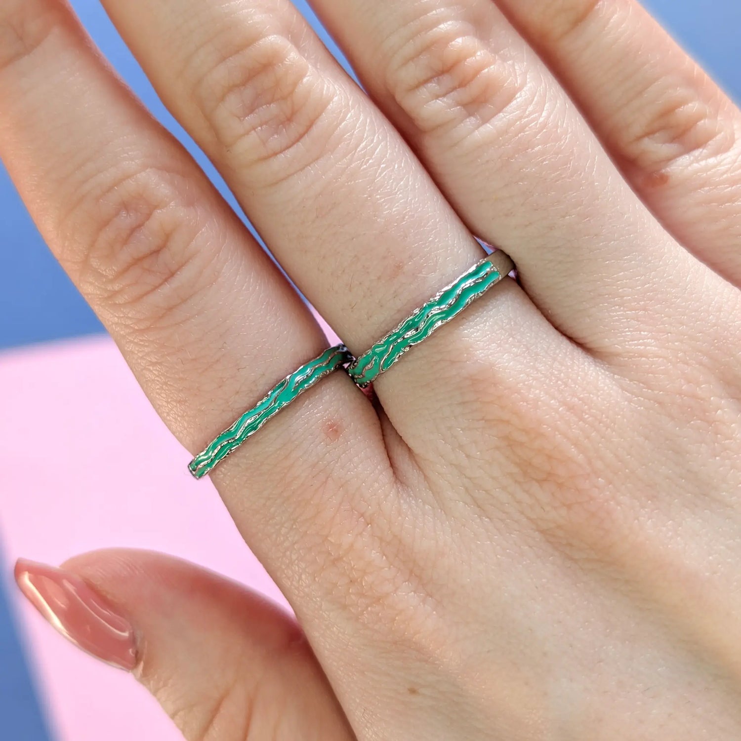 Unikalna mieszanka srebra 925 i czegoś zielonego. Oczywiście, jakżeby inaczej, regulowany rozmiar! Definitywnie jest to kluczowa, wyróżniająca go cecha, absolutnie nie cięcie kosztów!